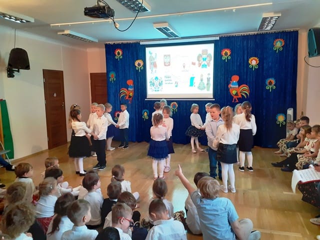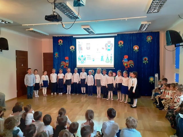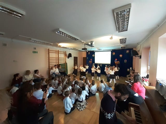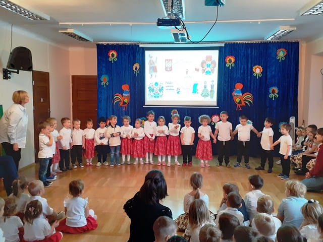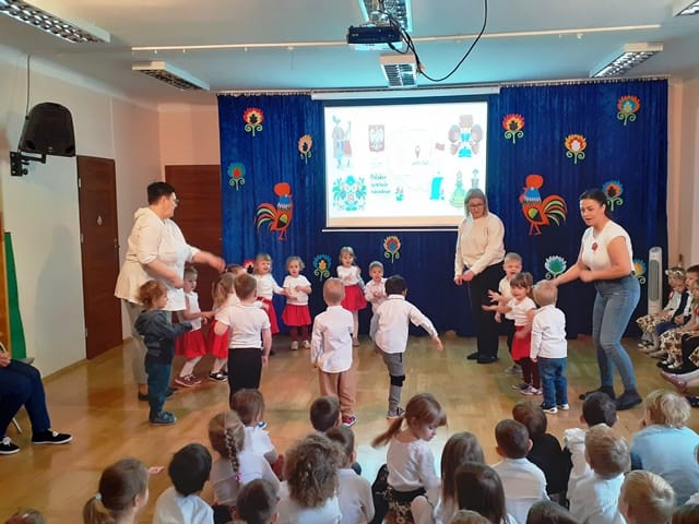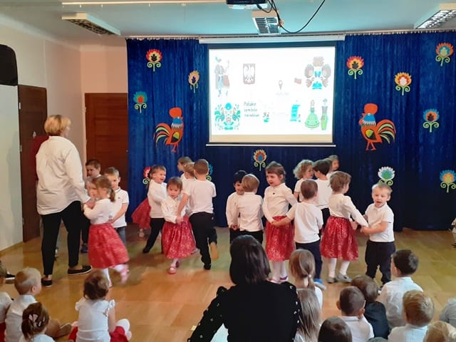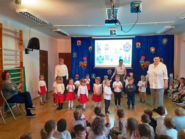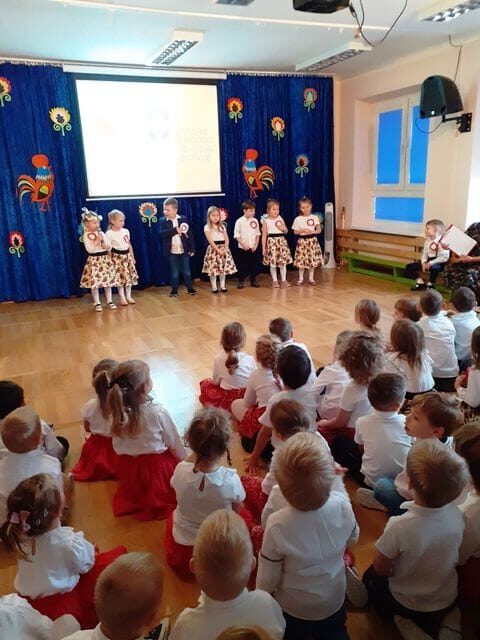 25 listopada spotkaliśmy się wszyscy na dużej sali. To było bardzo udane, muzyczne spotkanie przygotowane przez panią Olę z Biedronek. Każda grupa zaprezentowała piosenkę ludową lub patriotyczną. Dzieci były elegancko ubrane. Przypomnieliśmy sobie nasze symbole narodowe i krótką historię odzyskania przez Polskę niepodległości. „Bo ja jestem Polak mały, taki silny, taki śmiały. Kolor biały i czerwony dobrze znam, polską flagę w domu mam.” – ten cytat z piosenki zostanie z nami na długo.